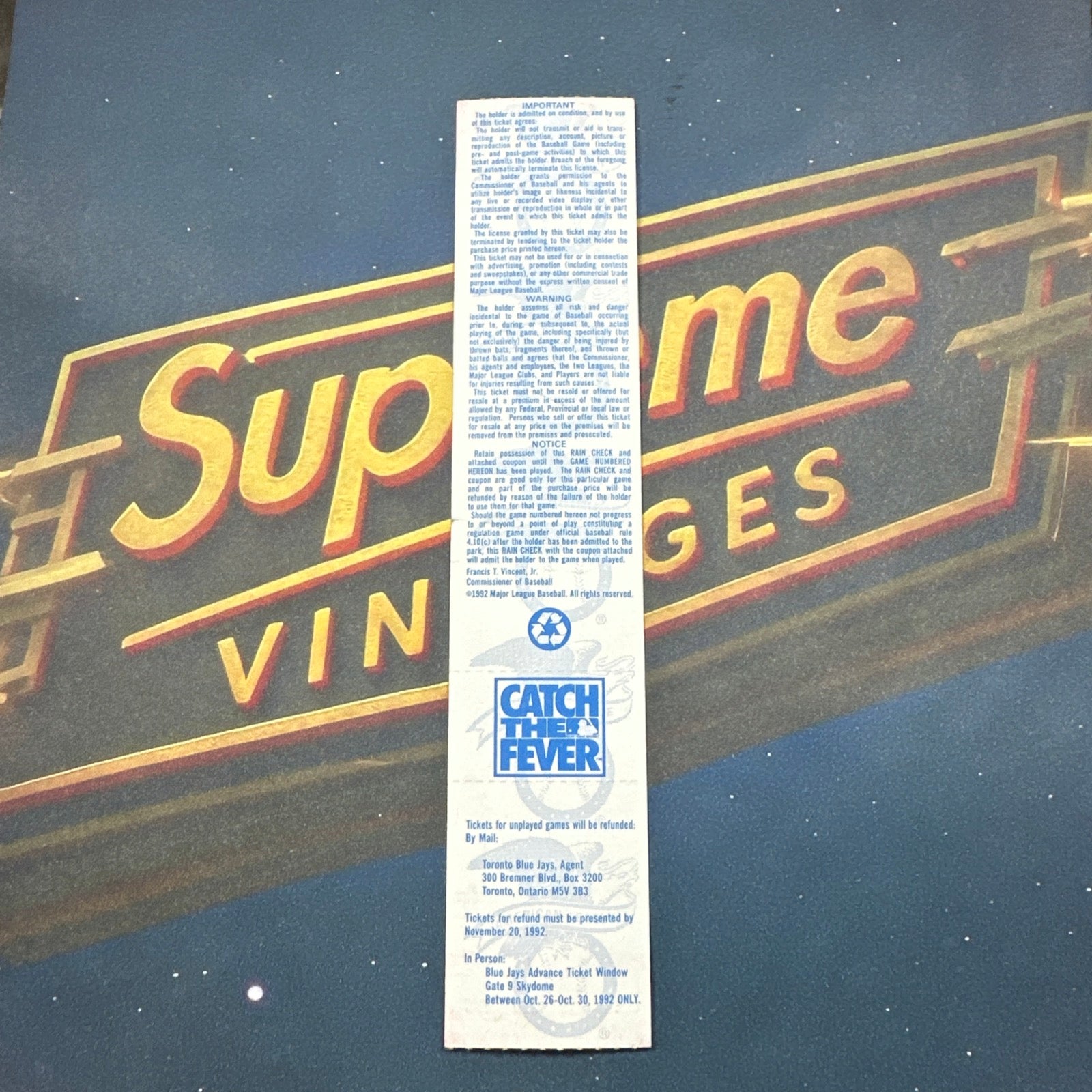 *IN MINT CONDITION* This would grade an 8 minimum by PSA Step back in time and secure a piece of baseball history with the 1992 American League Championship Full Ticket, featuring the Toronto Blue Jays in a thrilling Game 6. A must-have for collectors and fans alike, this original ticket stub captures the essence of the World Series excitement and the pinnacle of vintage sports memorabilia. Boasting a pristine, ungraded state that mirrors its Mint Gem 💎 quality, this item is a tribute to the era and the sport. It's an authentic slice of sports history that commemorates the Blue Jays' journey to the ALCS and the memorable Game 6 showdown. Don't miss your chance to own a piece of the 1992 baseball legacy. |