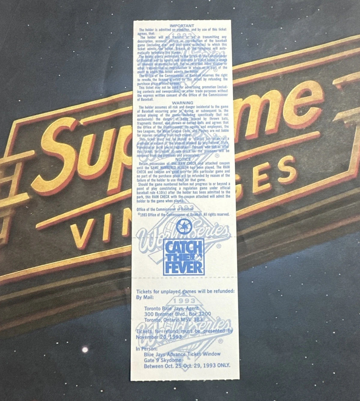 *IN MINT CONDITION* This would grade an 8 minimum by PSA Step back in time to the electrifying atmosphere of the 1993 World Series with this full ticket to Game 2, featuring the Toronto Blue Jays. A true collector's piece for baseball aficionados, this vintage stub is a tangible piece of sports history, original and ungraded, ready to be graded and showcased as a gem in any collection. Relive the excitement of one of baseball's most memorable events, captured on this piece of memorabilia from an era gone by. Whether you're a die-hard Blue Jays fan or a collector of sports tickets, this item from the 1993 World Series is a must-have, offering a unique glimpse into the sport's rich past. |